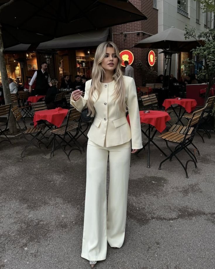 The structured blazer features a flattering fit with button detailing, while the high-waist wide-leg trousers offer comfort with a polished silhouette.