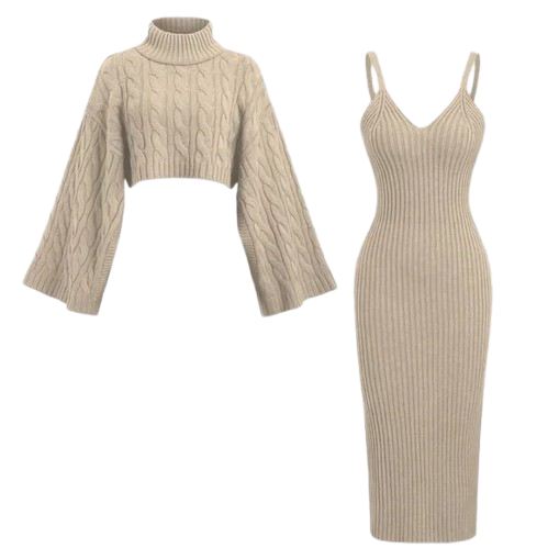Upgrade your cold-season wardrobe with this effortlessly chic two-piece knit set. Designed for both comfort and style, the set includes a cropped cable-knit sweater with a cozy turtleneck and relaxed long sleeves, paired with a flattering high-waisted ribbed maxi skirt.